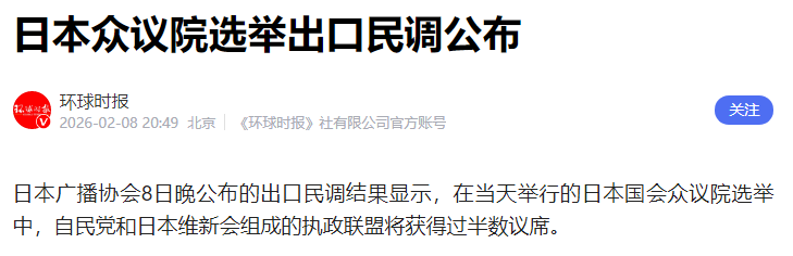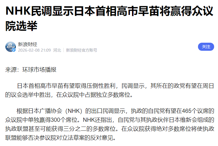 日本公共广播机构NHK的出口民调预测,日本首相高市早苗领导的自民党有望赢得多数席位,NHK预测自民党将在众议院465个席位中赢得274席至328席,远超获得多数席位所需的233席,若加上其执政伙伴维新会则最多可控制366个席位!