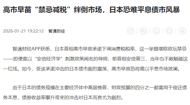 1月下旬,高市早苗关于降低消费税等主张,引发市场对于日本财政状况恶化的担忧,日本国债市场遭遇“抛售潮”,并影响全球金融市场。
